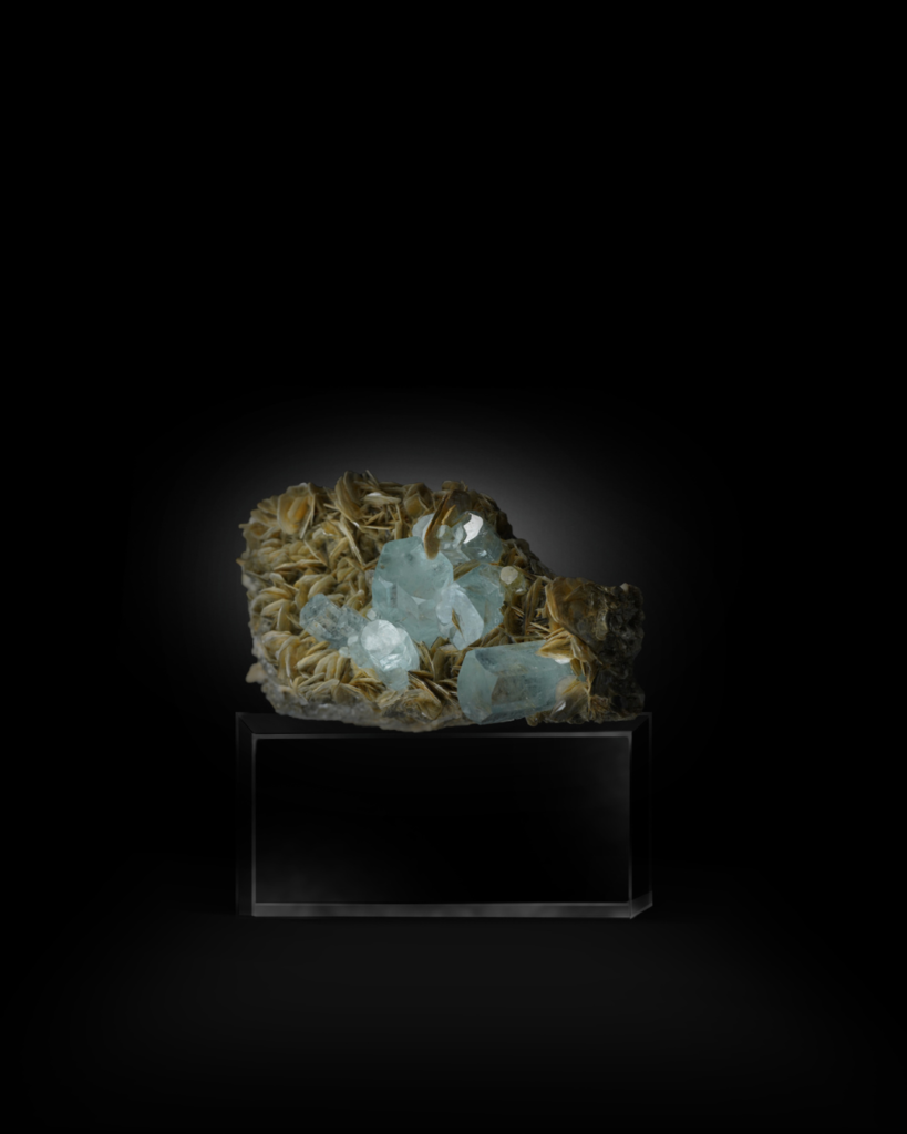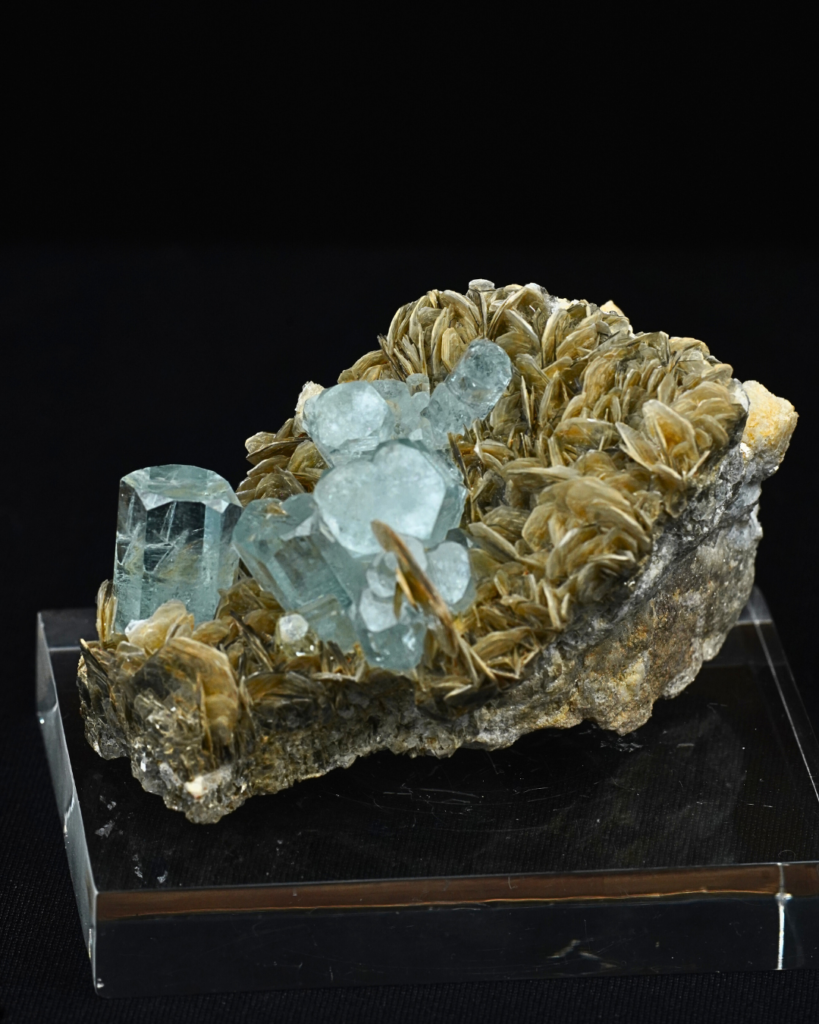 Side views highlight the three-dimensional structure of the cluster. The aquamarines rise confidently above the muscovite rosettes, creating contrast between the cool blue beryl and the warm golden-bronze mica blades. The muscovite forms layered, overlapping plates with reflective luster, enhancing the specimen’s visual movement.