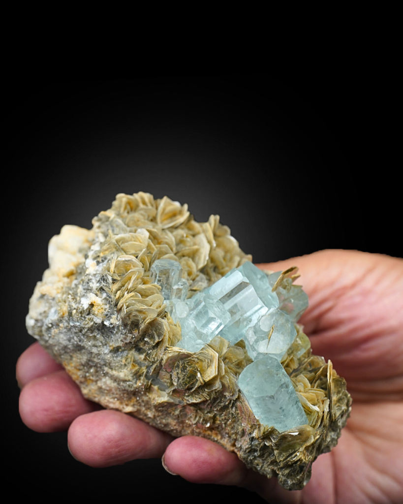 - Color: Icy blue aquamarine with golden-bronze muscovite