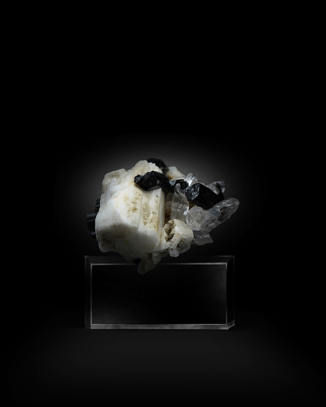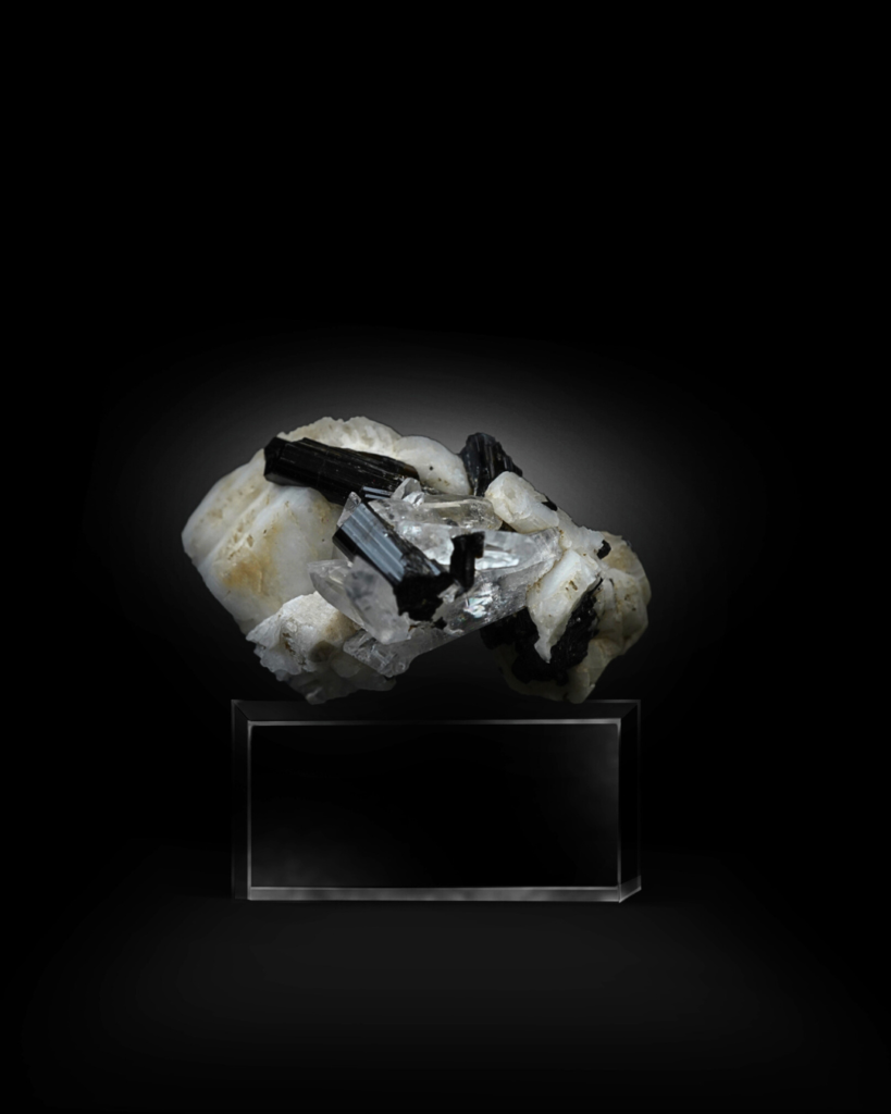 Side angles reveal transparent quartz crystals nestled between the tourmaline and feldspar. These quartz points display good clarity and natural terminations, adding brightness and dimensional layering to the composition. The quartz enhances the overall aesthetic by softening the monochrome palette with reflective highlights.