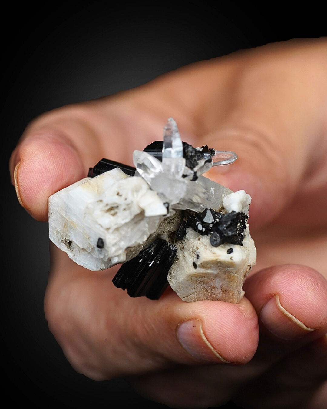 This compact and well-balanced specimen features sharp black tourmaline crystals emerging from a contrasting white feldspar matrix, accented by clear quartz points. The interplay of color and crystal form gives the piece strong visual character despite its small size.