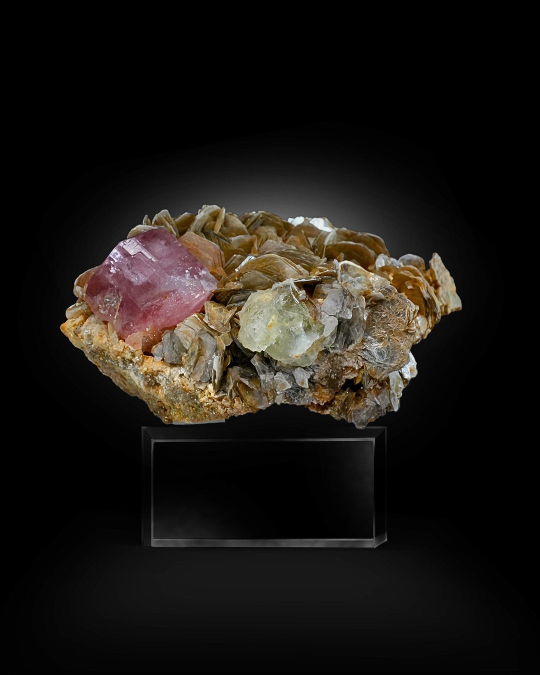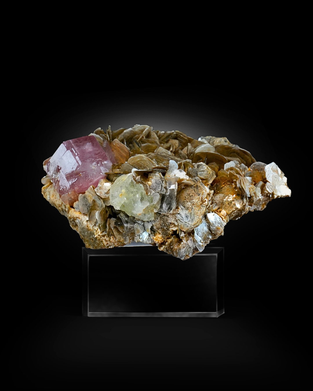 by fluorite, set on a muscovite-rich matrix. The contrast of color and texture