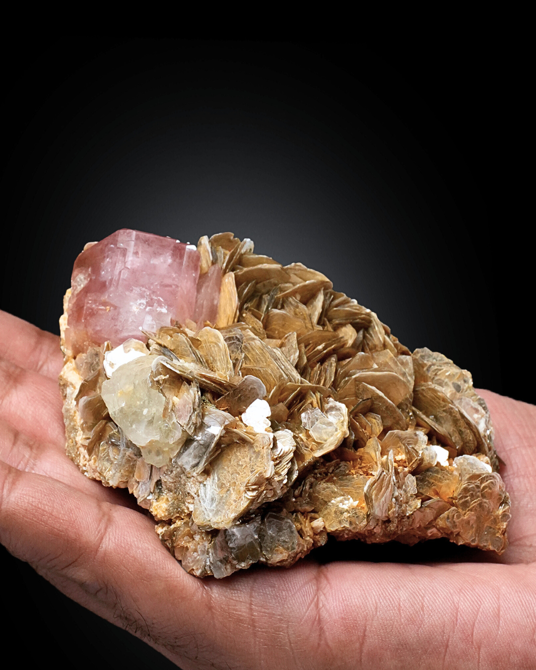 A natural specimen featuring a well-formed pink apatite crystal accompanied