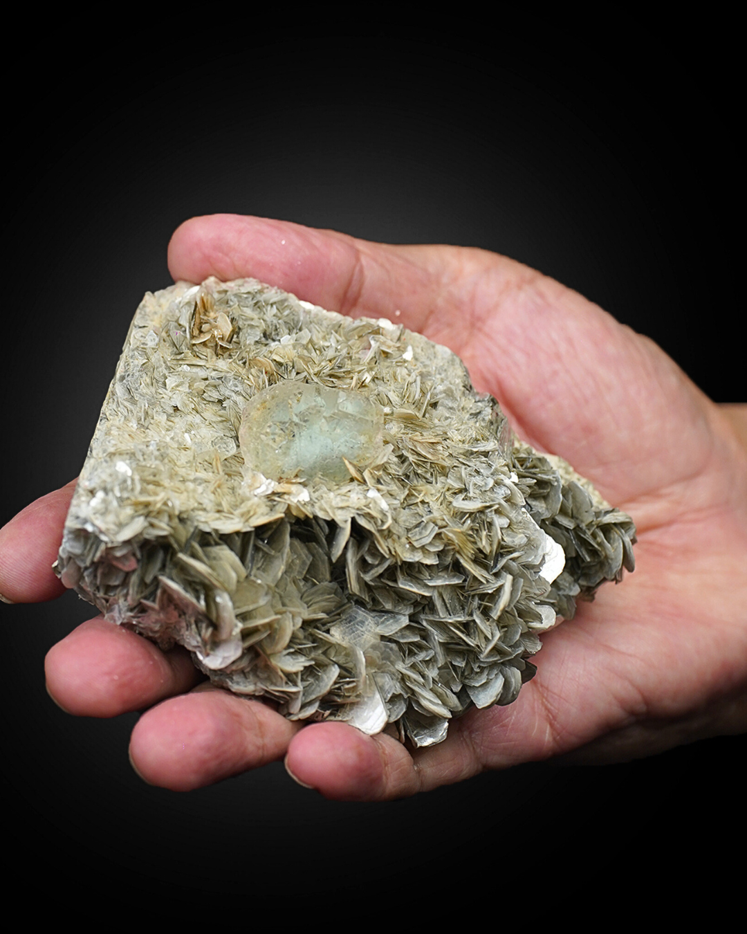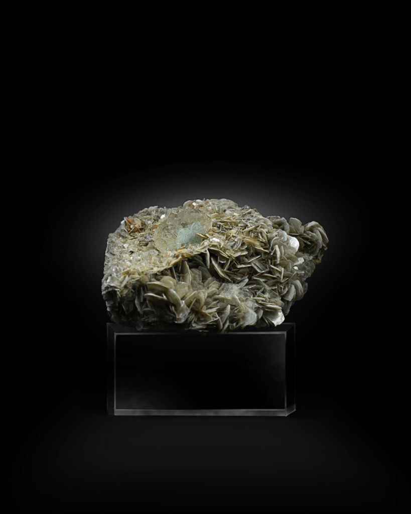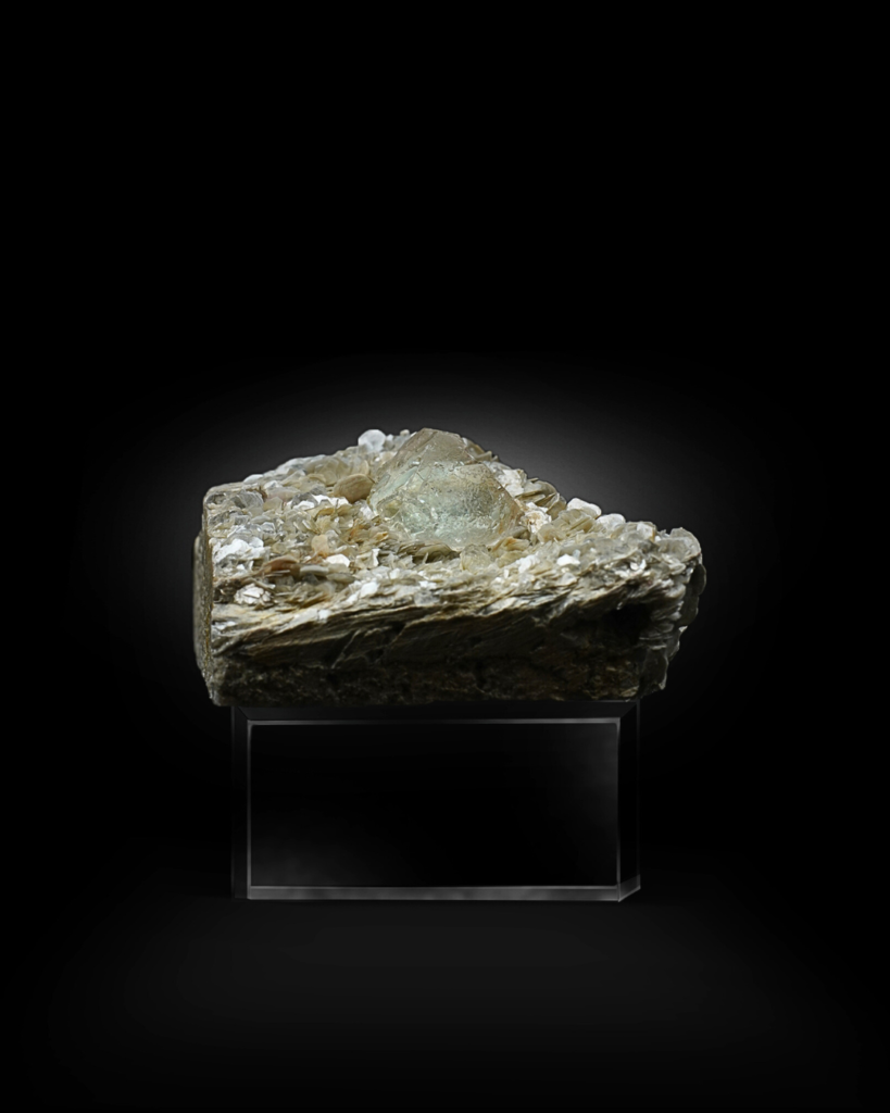 From the top perspective, the fluorite appears well-positioned and proportionate to the matrix, giving the specimen strong display presence. The muscovite creates layered movement across the surface, while the overall structure remains stable and naturally balanced.