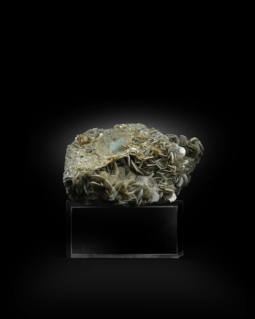 Side angles highlight the fluorite’s form and translucency. Gentle internal reflections enhance its soft color, while the muscovite below forms tightly stacked, bladed sheets with a silvery metallic sheen. The contrast between the smooth fluorite and the textured mica produces strong visual appeal.